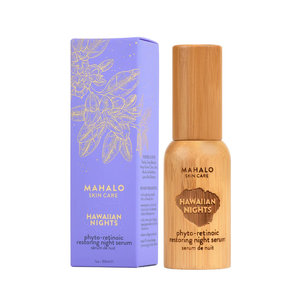 The Hawaiian Nights Phyto-retinoic Restoring Night Serum on kasviperäinen vaihtoehto retinoliseerumille. Mahalon yöseerumi sisältää kasviperäistä A-vitamiinia, joka korjaa ihovaurioita ja ennaltaehkäisee ihon ikääntymistä luonnollisesti. Seerumin koostumuksessa yhdistyvät synteettisen retinolin hyödyt ja ihoa uudistavat ominaisuudet ilman synteettisen retinolin ihoa ärsyttäviä haittavaikutuksia. Sopii erityisesti samealle, väsyneelle ja epäpuhtaalle iholle.
