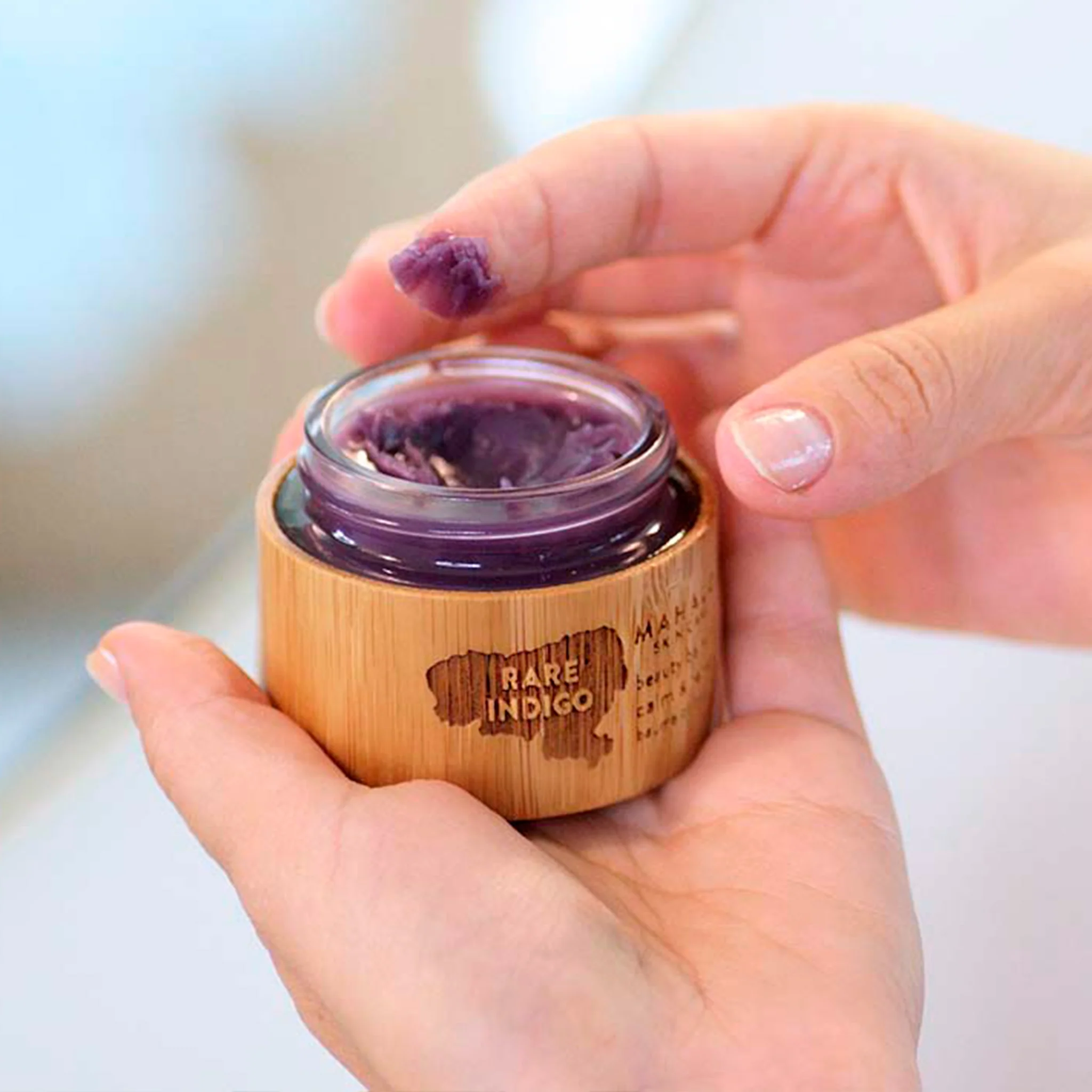 Rare Indigo on kevyt balmi, joka sulaa nopeasti nestemäiseksi nektariksi lämmön vaikutuksesta. Tarvitset vain pienen, alle herneen kokoisen nokareen balmia kerrallaan.